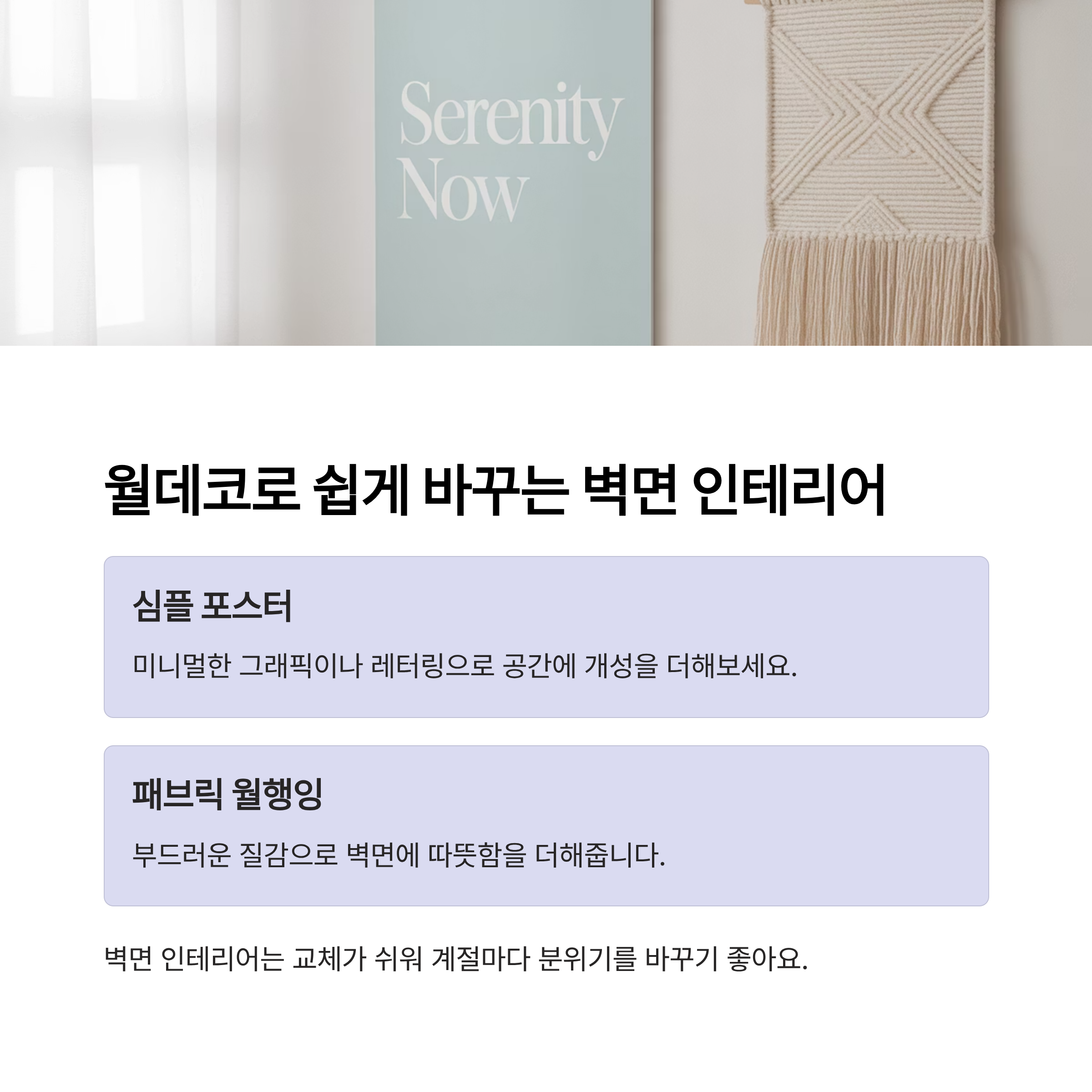 레터링 액자, 패브릭 월행잉 같은 아이템은 교체도 간편하고 공간 활용도가 높아요.