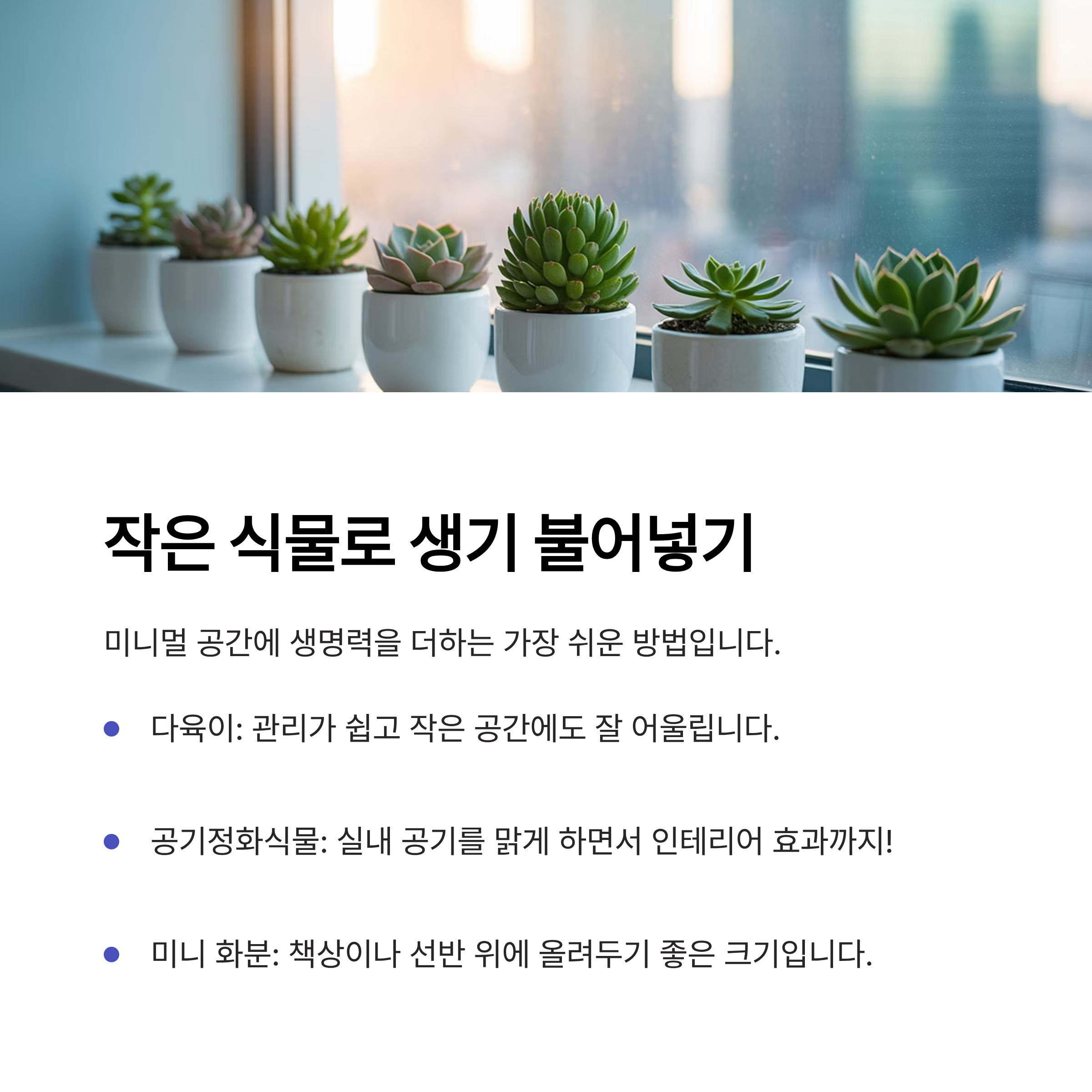 다육식물이나 공기정화식물은 미니멀 감성과 잘 어울리는 자연 소품이에요.
