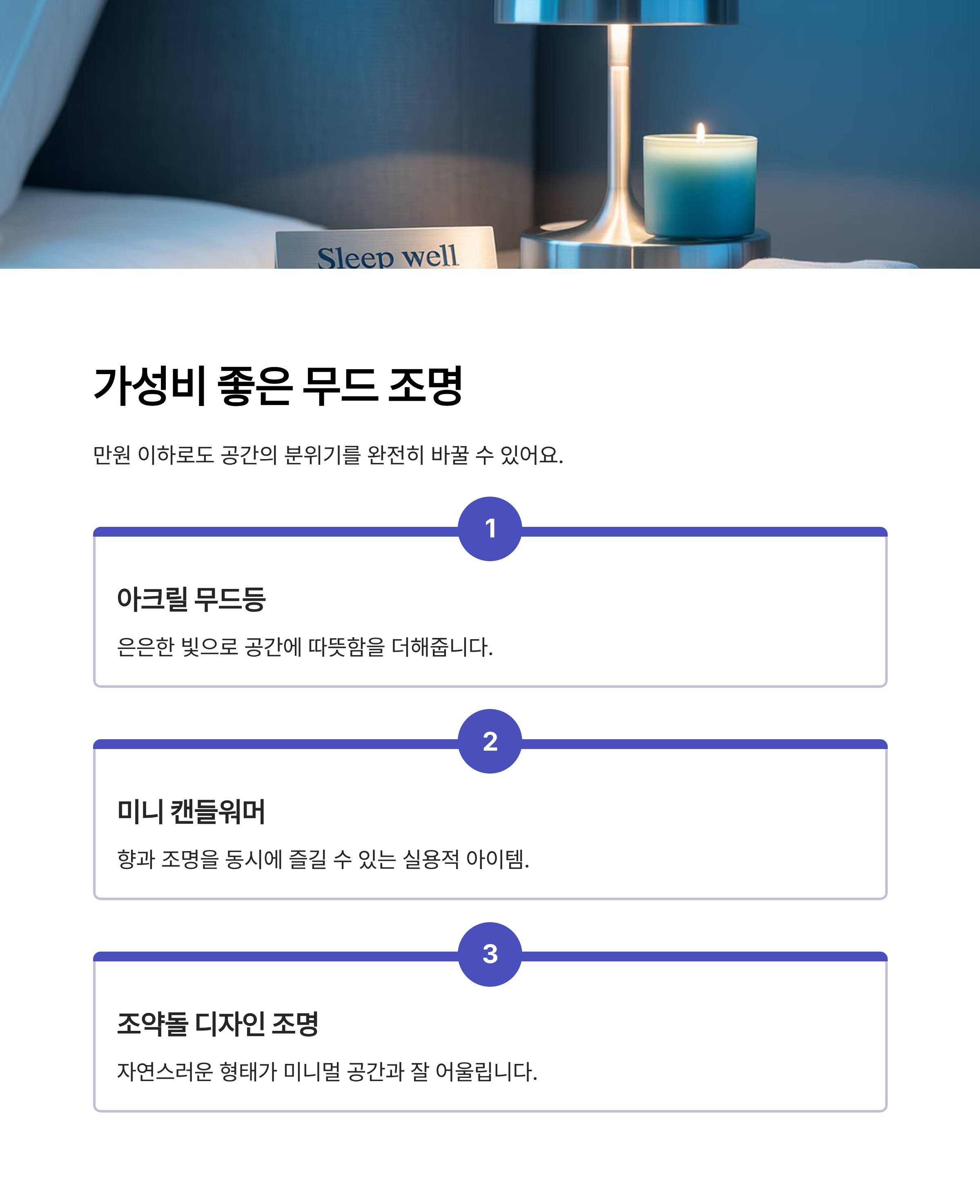 가성비를 챙기면서도 감성을 살린 소품으로는 아크릴 무드등, 캔들워머, 조약돌 조명이 있습니다.