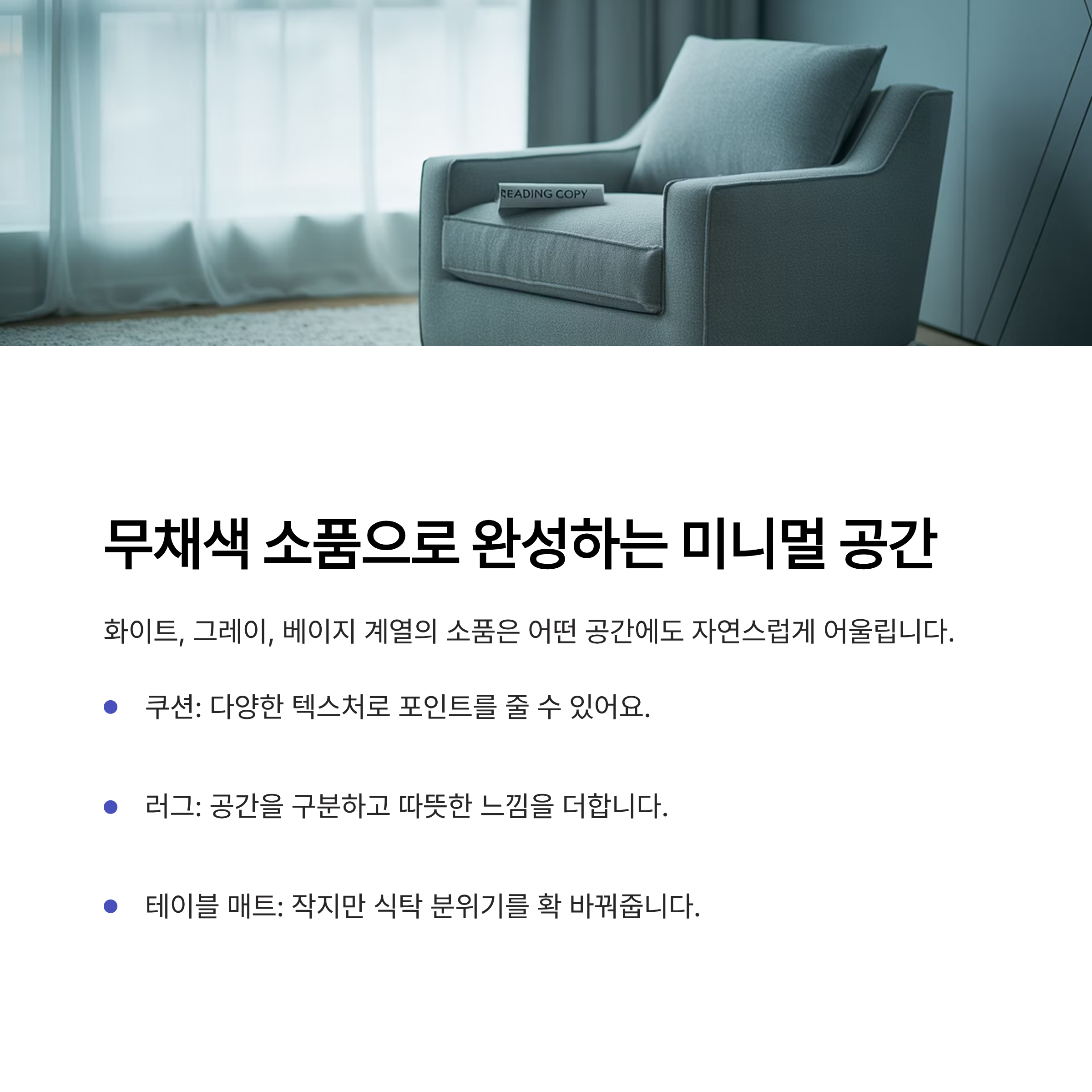 화이트, 그레이, 베이지 등은 미니멀 인테리어와 잘 어울리는 기본 색상입니다.