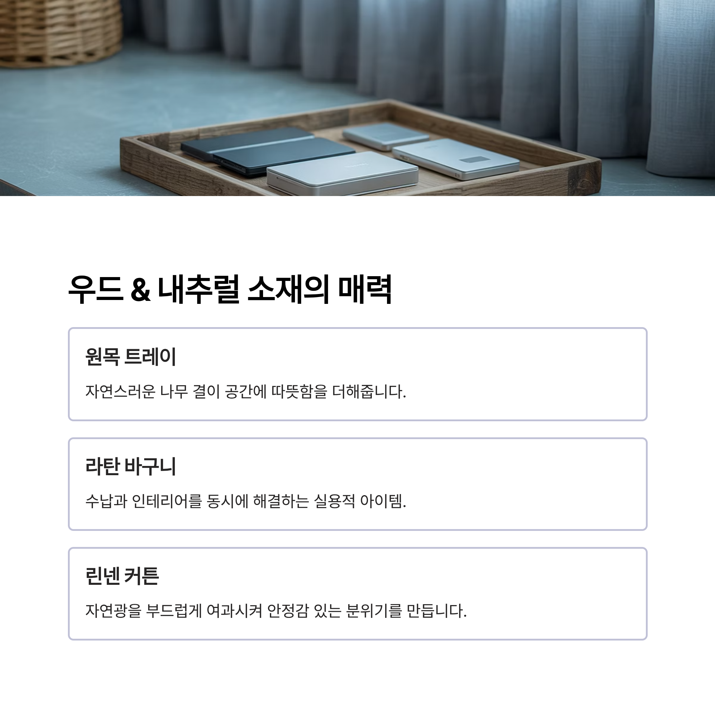 특히 우드 트레이, 라탄 바구니, 린넨 커튼은 심플한 공간에 아늑함을 더해주는 대표 아이템이에요.