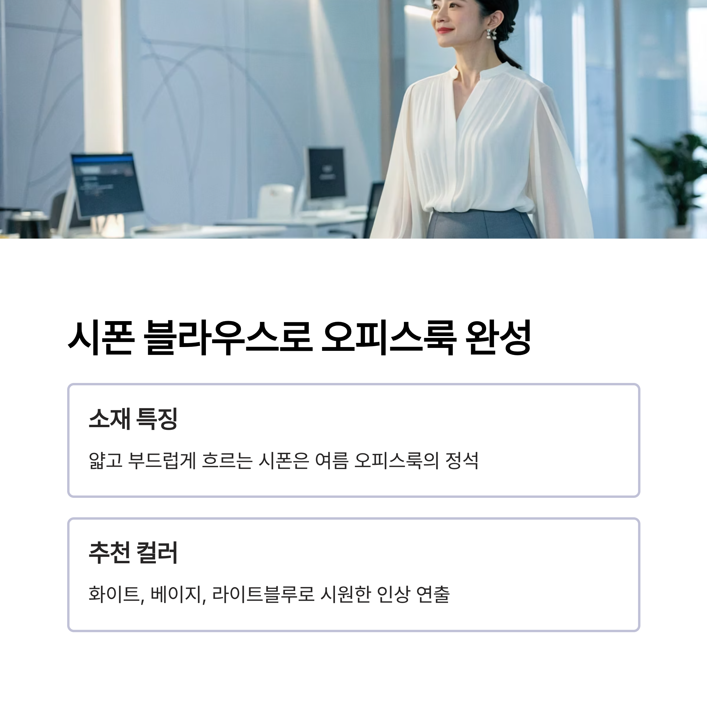 얇고 부드럽게 흐르는 시폰 블라우스는 여름 오피스룩의 정석입니다.