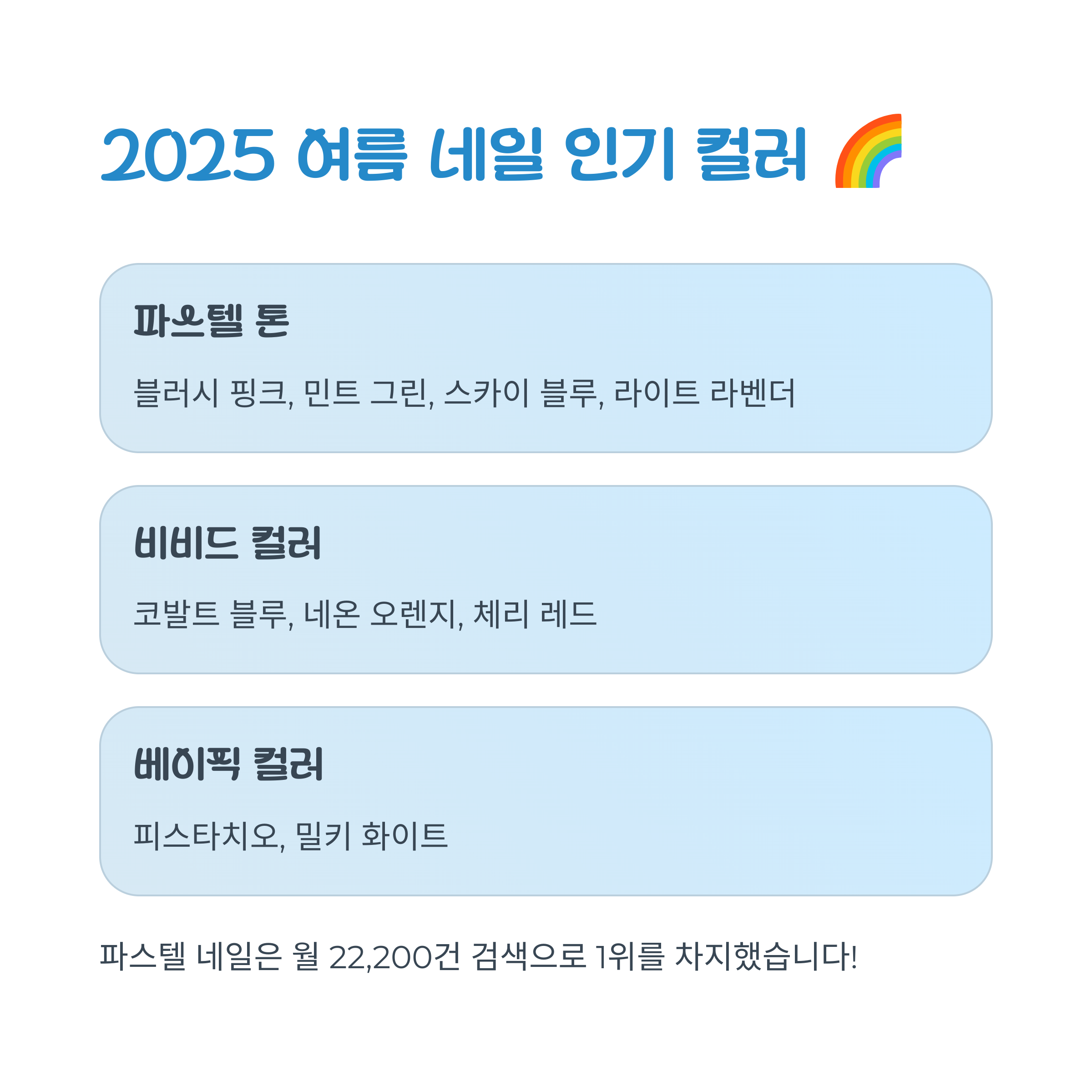 2025년 여름 네일 트렌드는 파스텔, 크롬, 젤리 등 감각적인 디자인이 인기입니다. 비치코어부터 미니멀 프렌치까지 상황별 추천도 확인해보세요.