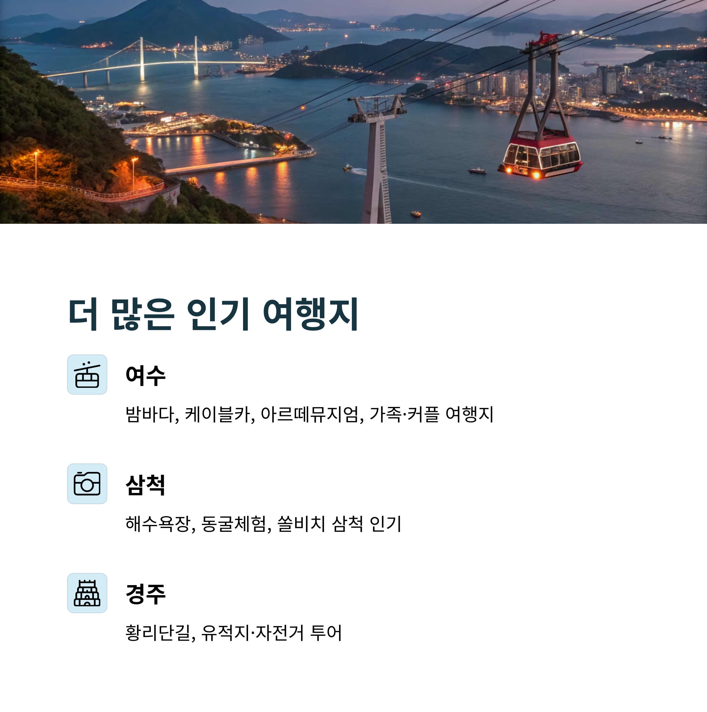- 여수: 밤바다, 케이블카, 아르떼뮤지엄, 가족·커플 여행지