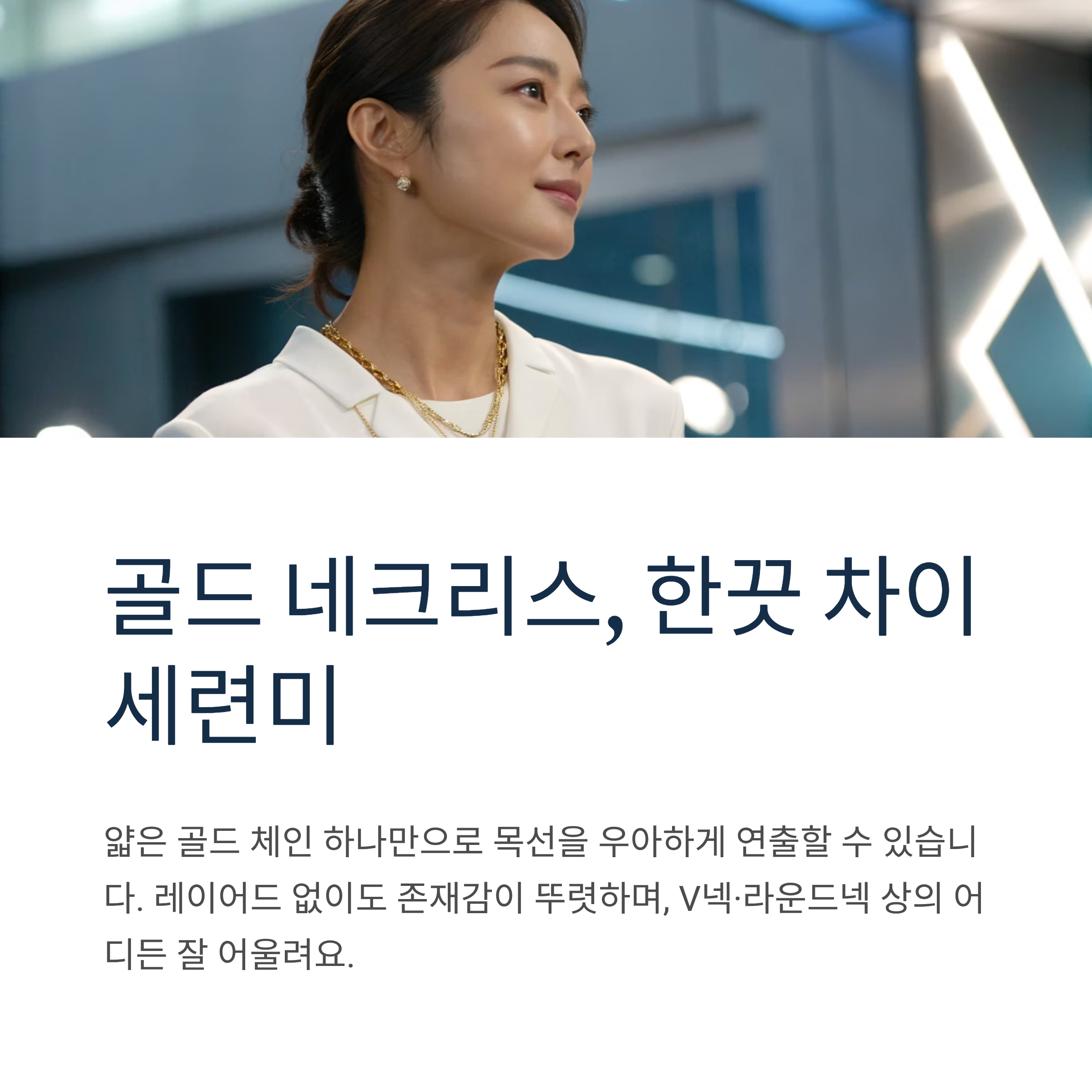 심플 골드 네크리스는 레이어드 없이도 존재감이 뚜렷하며, V넥·라운드넥 상의 어디든 잘 어울려 활용도가 높아요.
