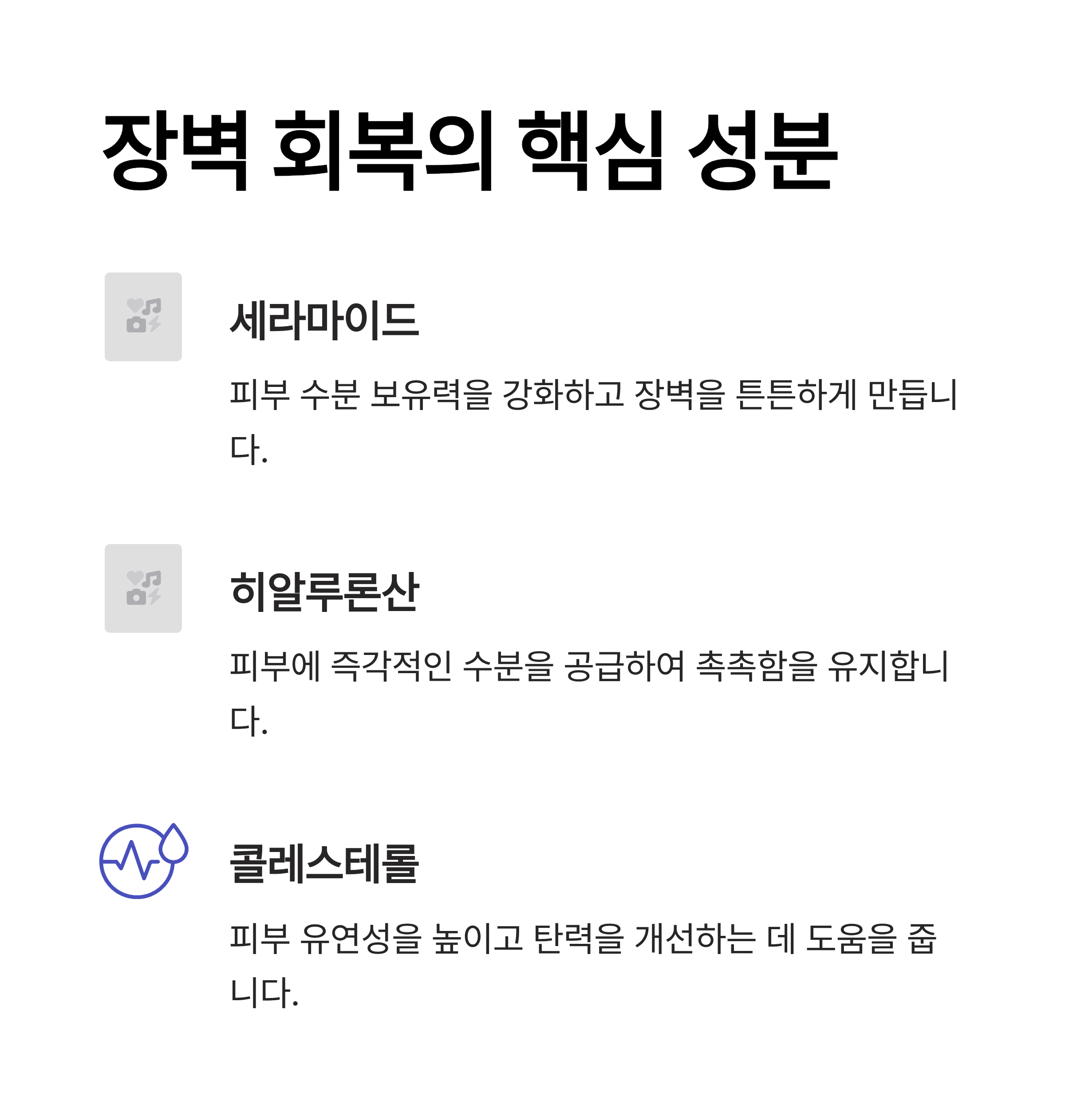 세라마이드는 수분 보유력 강화, 히알루론산은 수분 공급, 콜레스테롤은 피부 유연성을 높이는 역할을 합니다.