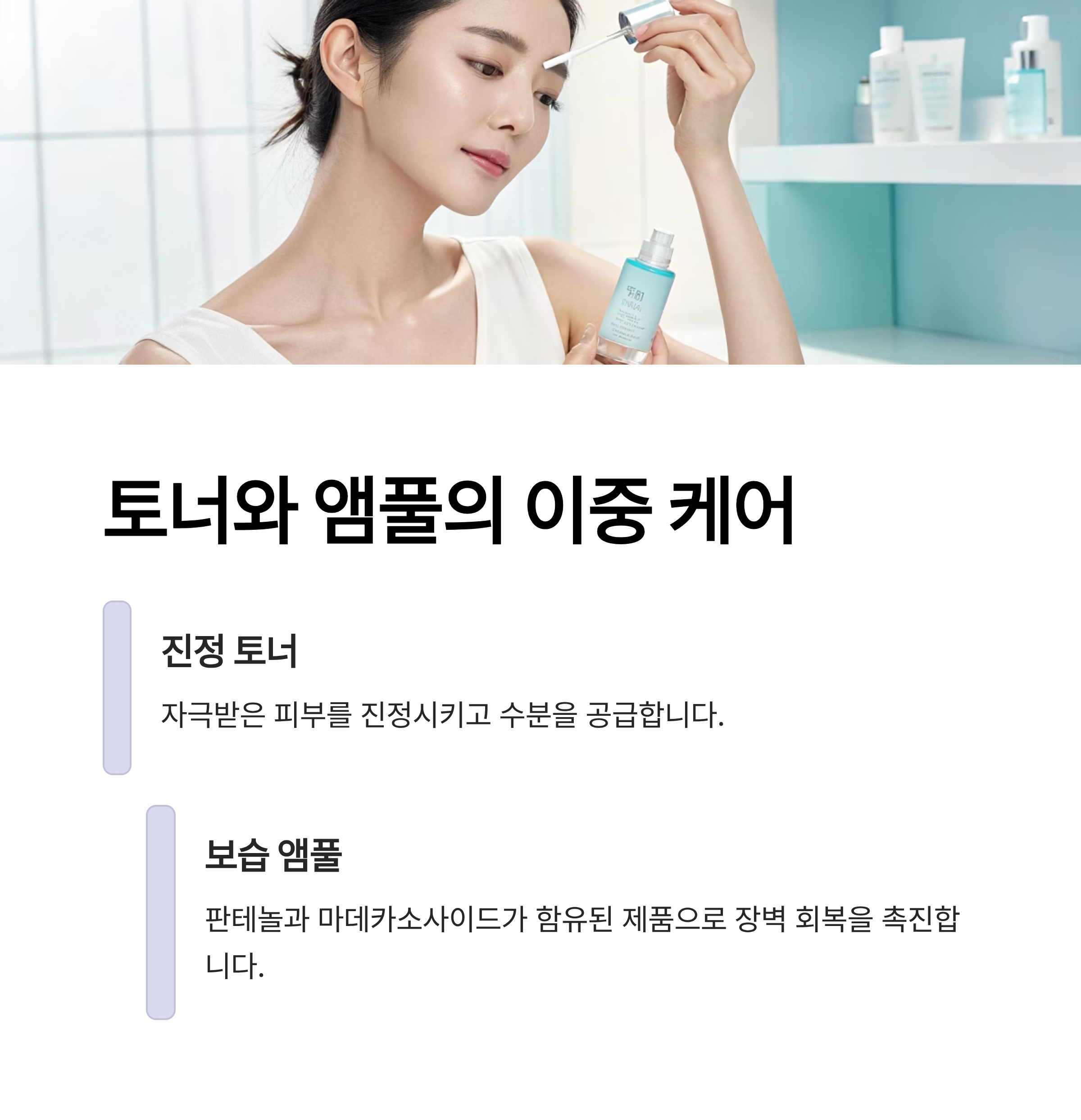 진정 성분 토너로 피부를 안정시킨 뒤, 판테놀마데카소사이드가 함유된 보습 앰풀을 사용하면 장벽 회복 속도가 빨라집니다.