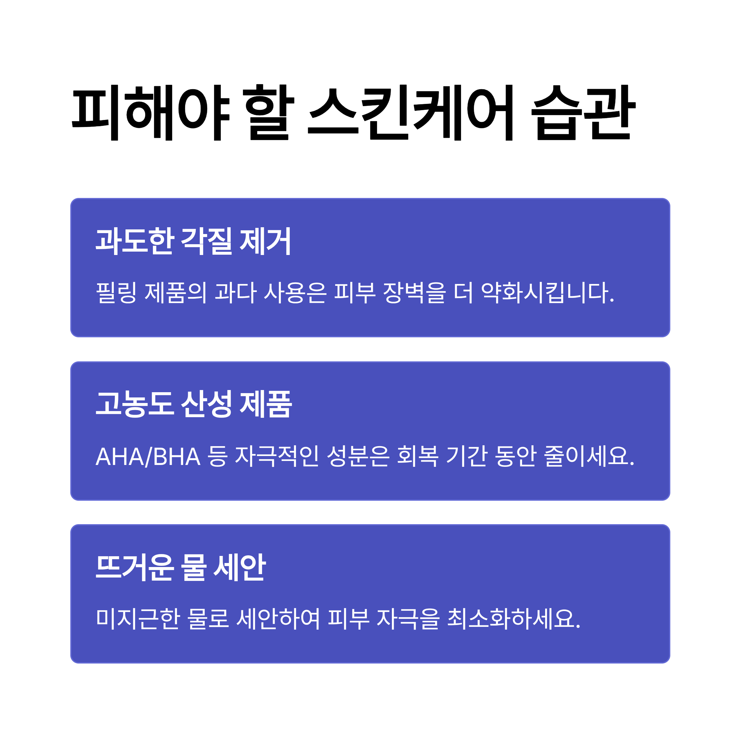 과도한 각질 제거제 사용, 고농도 산성 제품 매일 사용, 뜨거운 물 세안은 피부 장벽에 큰 부담을 줍니다.