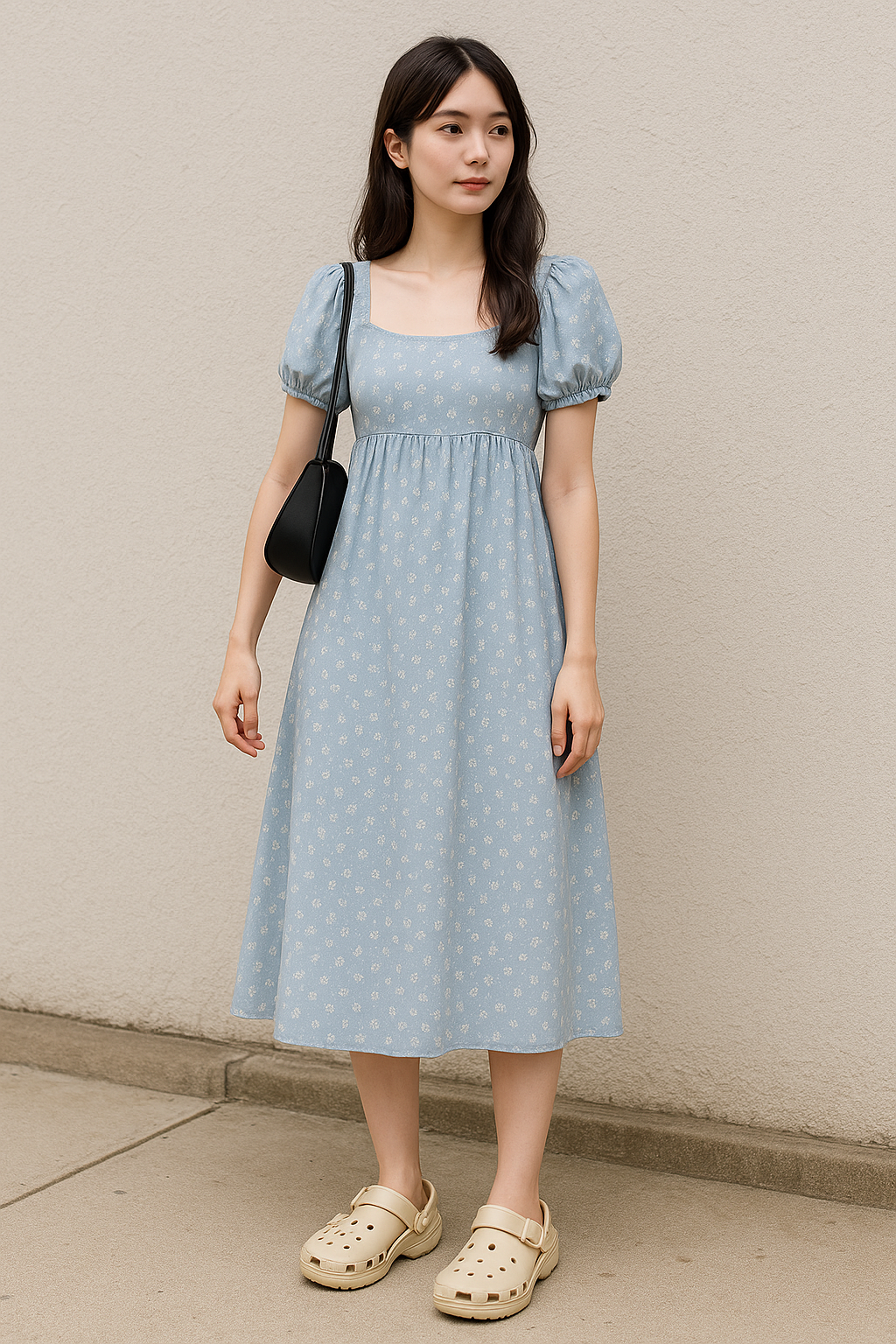 크록스 샌들 + 롱 원피스 + 미니백. 우아함과 편안함을 동시에!