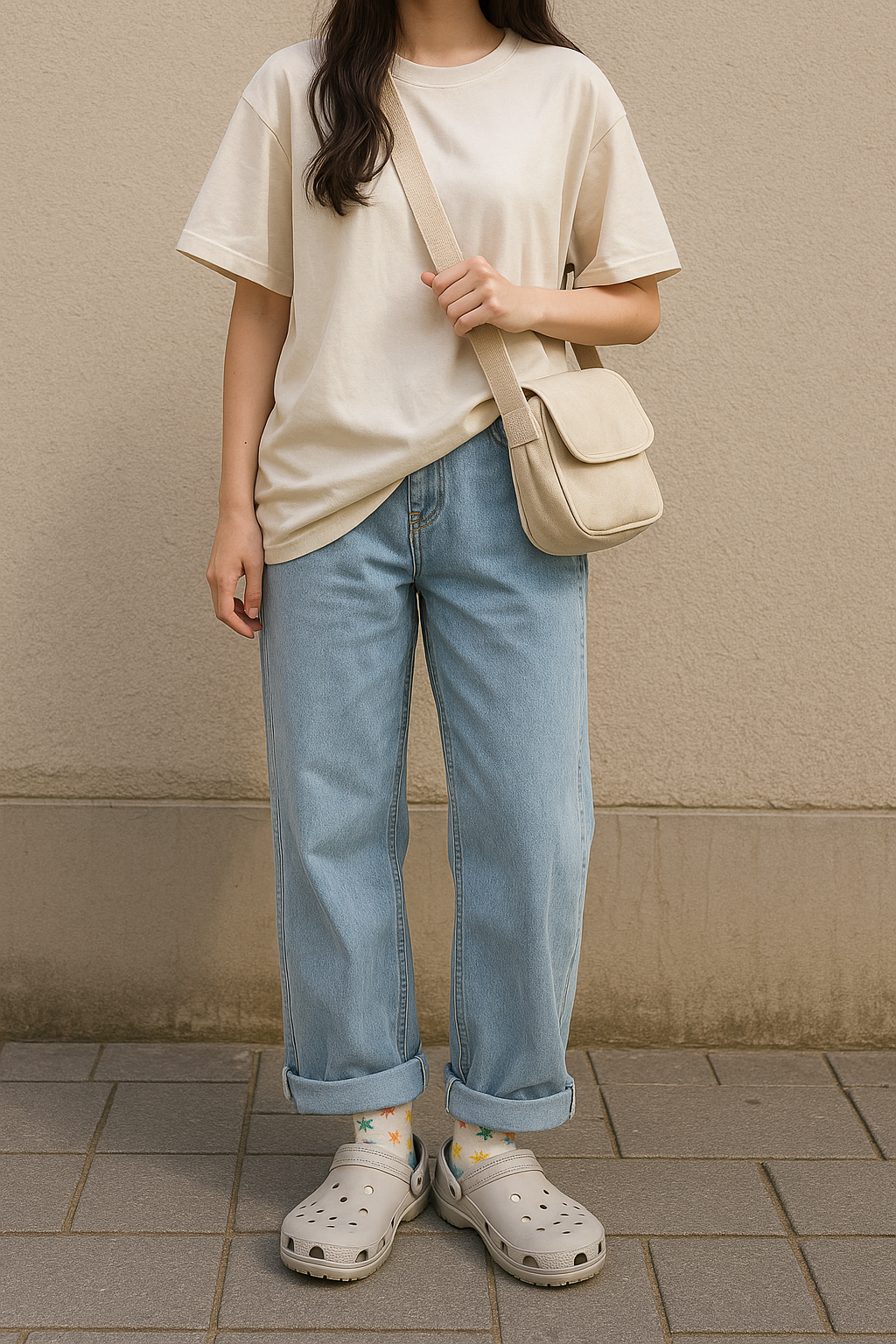 • 코디 조합: 크록스 클래식 + 오버핏 티셔츠 + 와이드 팬츠 + 크로스백