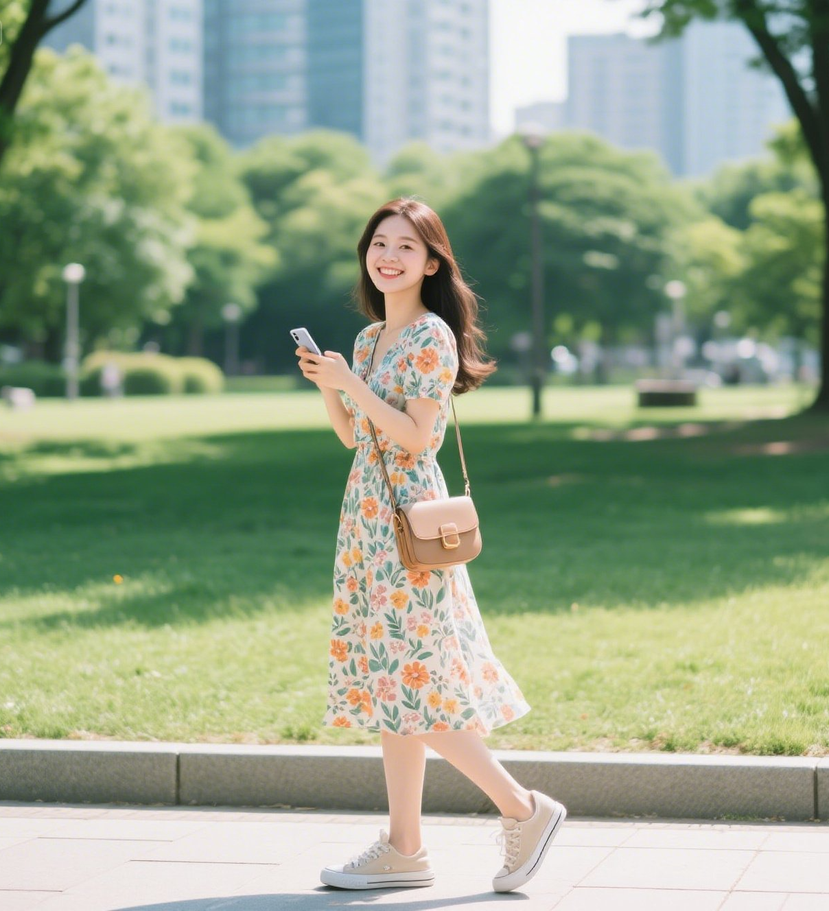 플라워 패턴, 솔리드 컬러 원피스와도 크로스백+운동화 조합은 자연스럽게 어울립니다.