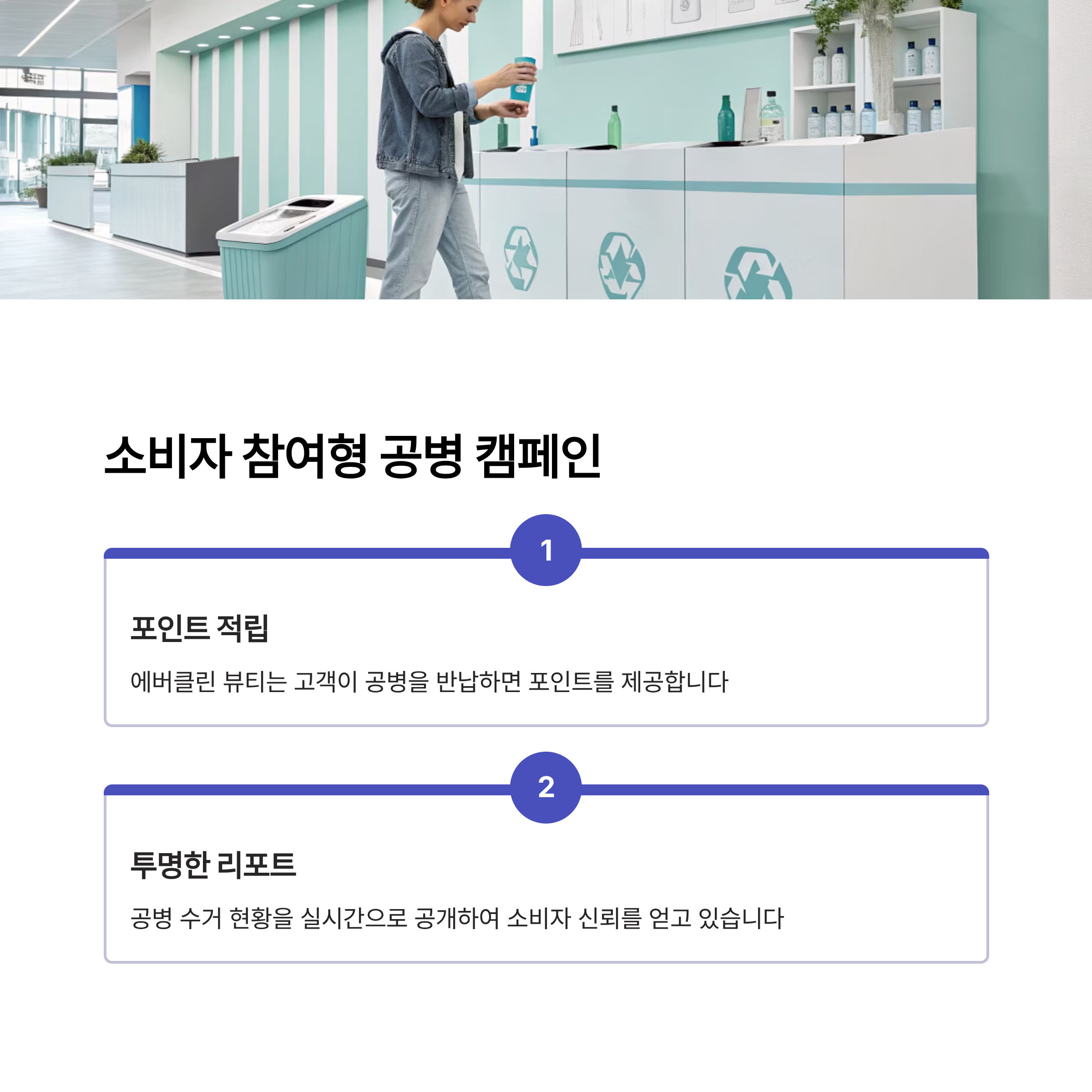 ‘에버클린 뷰티’는 고객이 공병을 반납하면 포인트를 제공하고, 수거 현황을 투명하게 공개하여 신뢰를 얻고 있습니다.