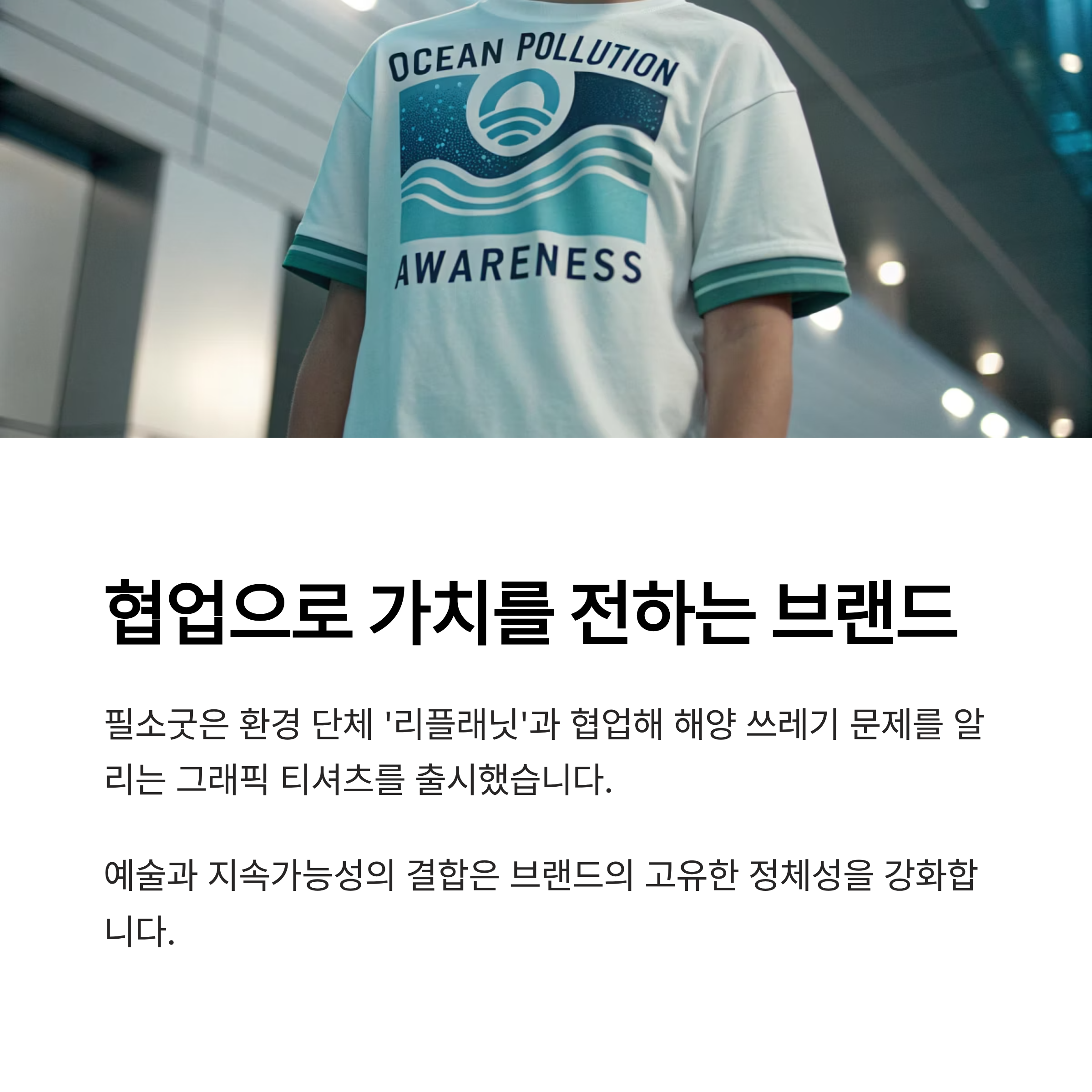 ‘필소굿’은 환경 단체 ‘리플래닛’과 협업해 해양 쓰레기 문제를 알리는 그래픽 티셔츠를 출시했습니다.